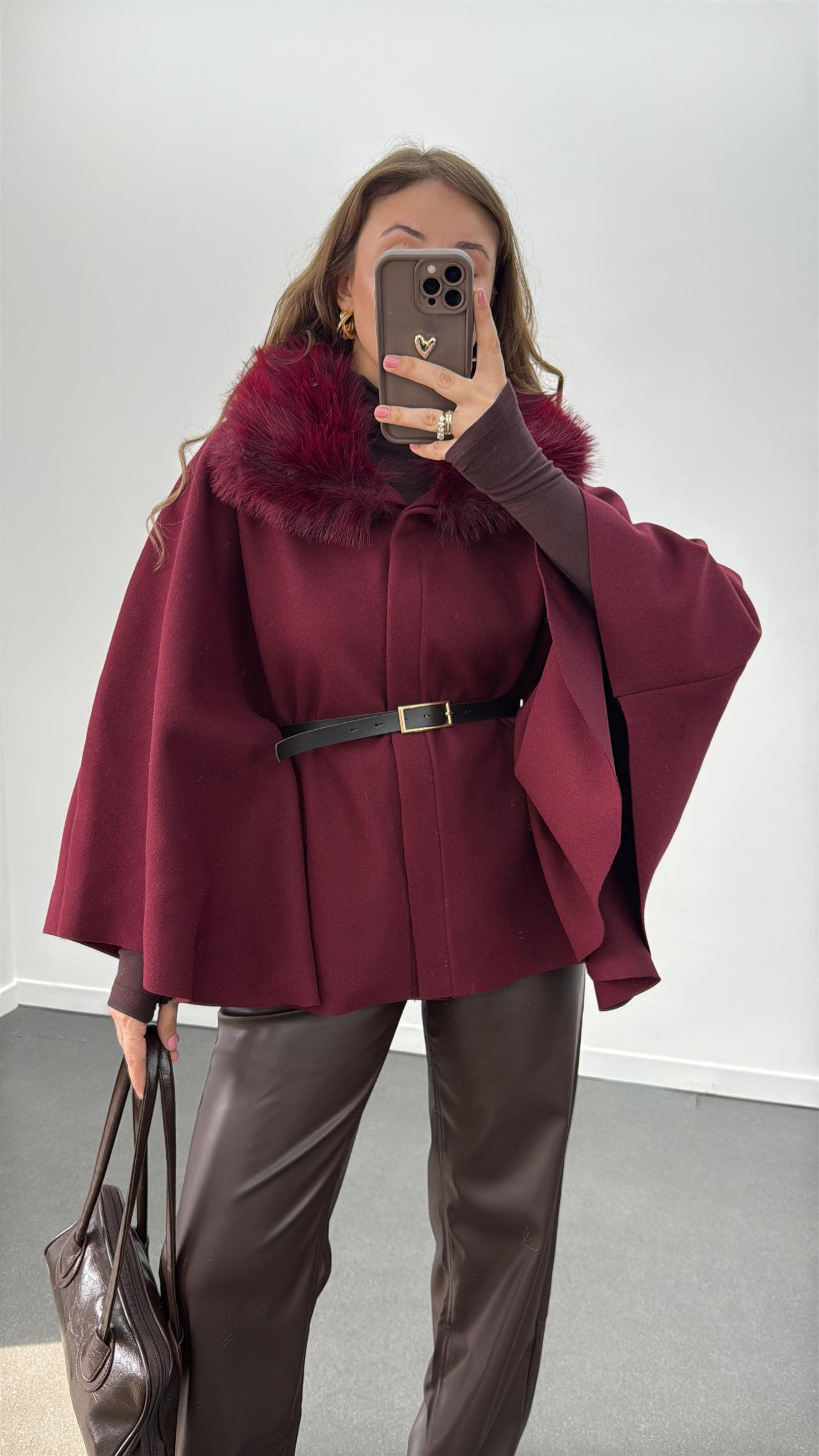Barbara Bordo Kürk Yaka Kemerli Kaşe Panço Kaban