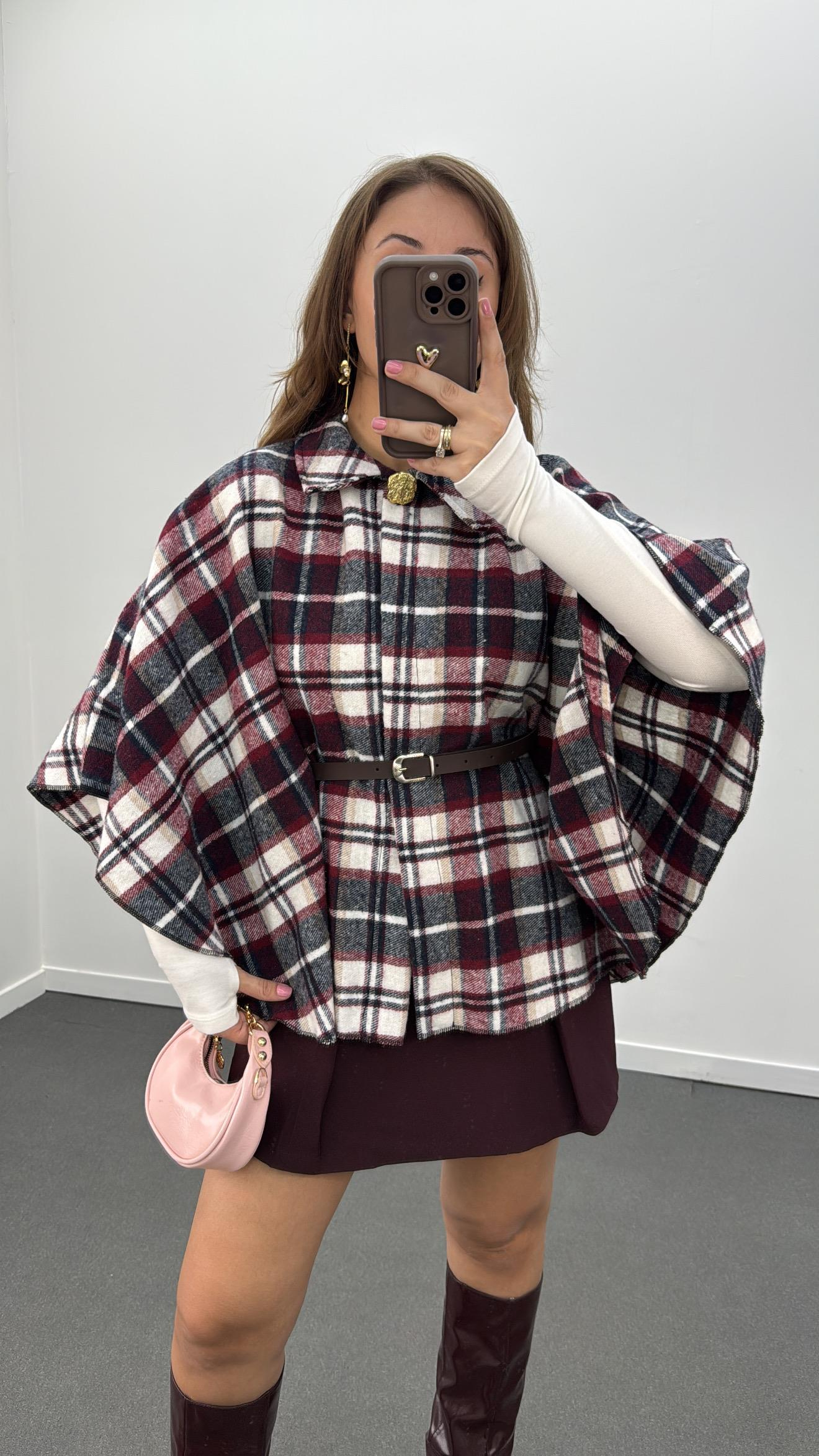 Faylin Bordo Ekoseli Kemerli Panço