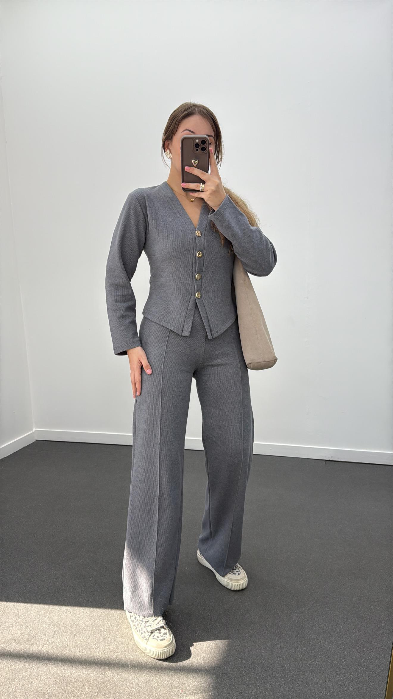 Freya Gri Gold Düğmeli Hırka Ve Triko Pantolon Takım