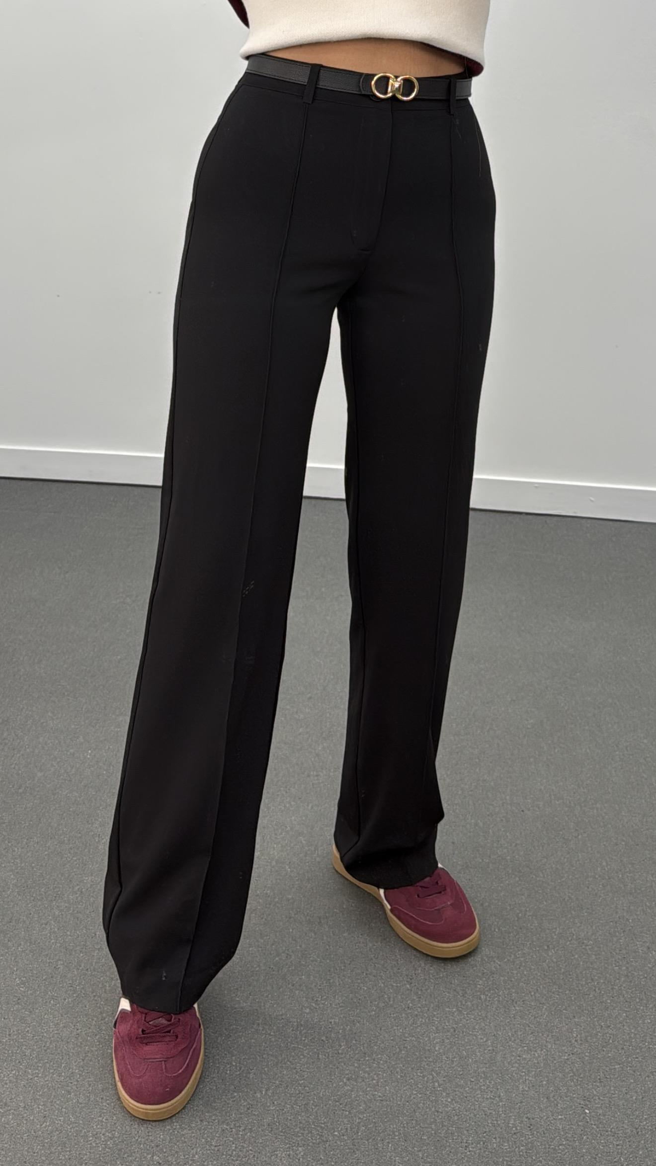 Meg Siyah Nervür Dikişli Palazzo Kumaş Pantolon