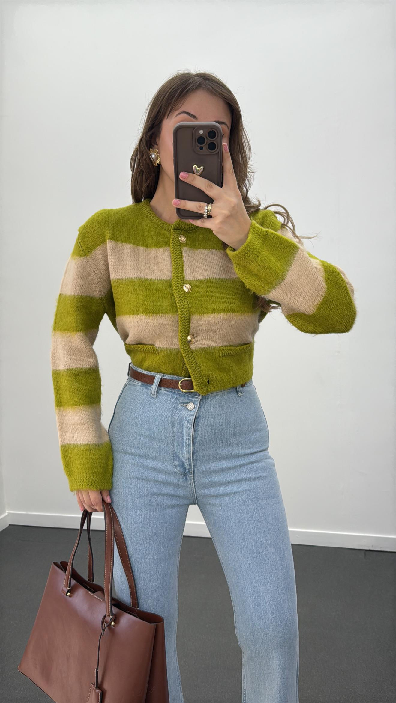 Suare Yeşil Bej Çizgili Gold Düğmeli Premium Hırka